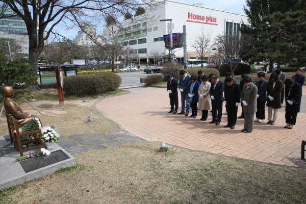 [수원=임종인 기자] 경기 수원시의회 의원들이 최근 수원 올림픽공원내 '평화의 소녀상'에서 위안부 피해자 고(故) 용담 안점순 할머니를 추모했다.