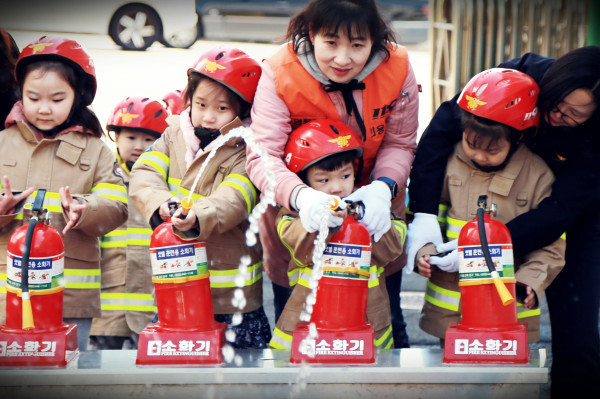 서울 영등포소방서는 2일 오전 목동 119안전센터에서 구립다온어린이집과 튼튼어린이집 유아 90여명을 대상으로 '이동안전체험 차량 119안전체험 교실'을 운영했다. 사진은 어린이들이 소화기 사용 실습을 하고 있는 모습. (사진제공=영등포소방서)