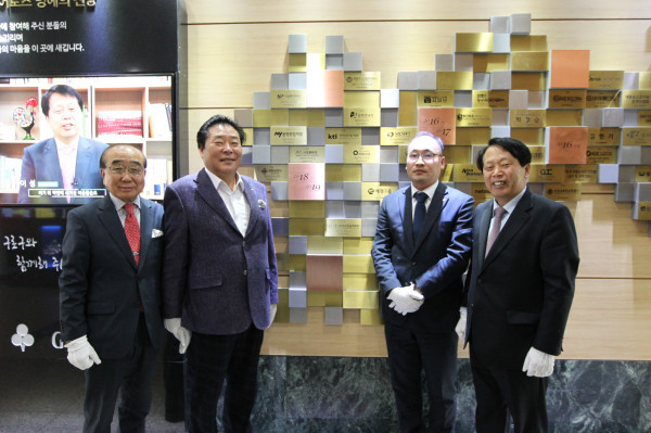 2일 구로구가 ‘구로히어로즈 가입식 및 명예의 전당 헌액식’을 개최했다. 이날 구는 (주)문영종합개발 박문영 회장, (주)오메카 오정은 대표에게 사회공헌인증서를 수여했다. 사진은 ‘구로히어로즈 명예의 전당’에 앞에서 가입자들과 기념촬영을 하고있는 이성 구청장(오른쪽)의 모습. (사진제공=구로구청)