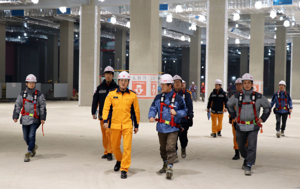 경기 부천소방서는 최근 부천시 옥길동 소재 이마트 부천옥길점 신축 공사현장에 강신광 서장 및 관할119안전센터장 등 총 7명이 방문해 대형공사장 긴급 현장안전컨설팅을 실시했다. 사진은 강 서장이 관계자들과 이야기를 나누는 모습. (사진제공=부천소방서)
