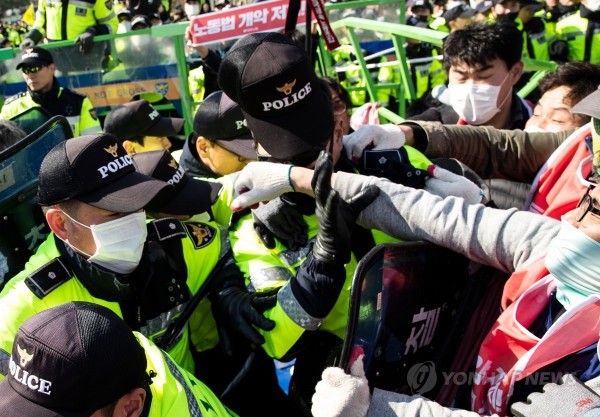 3일 오후 국회 정문에서 노동법 개악 저지 등을 촉구하며 국회 경내로 진입을 시도한 민주노총 관계자들과 충돌한 경찰이 가격당하고 있다.