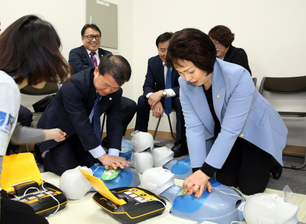 서울 서대문구의회 의원들이 최근 의회 본회의장에서 '심폐소생술 교육'을 받았다. 사진은 이날 의원들이 심폐소생술 실습을 하고 있는 모습. (사진제공=서대문구의회)