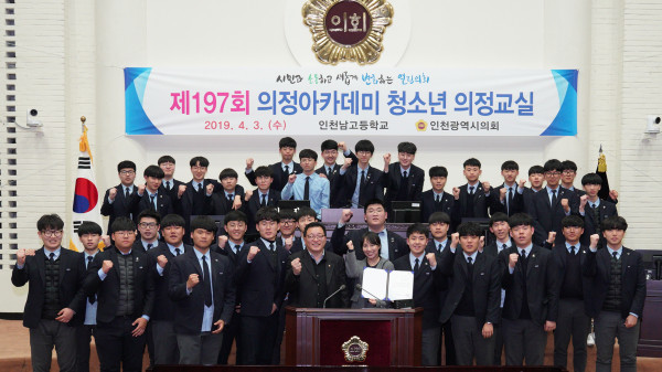 [인천=문찬식 기자] 인천시의회는 최근 개최한 '제197회 의정아카데미 청소년 의정교실'에 인천남고등학교 학생회 임원 38명이 참가했다고 밝혔다.