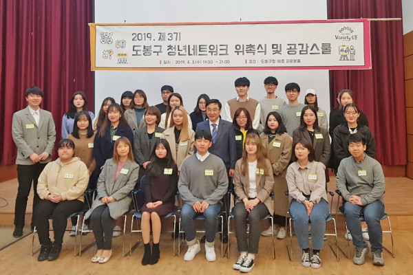 서울 도봉구는 최근 구청 자운봉홀에서 청년네트워크의 활동 홍보 및 정책 의견 제시 등을 하는 ‘제3기 청년네트워크’ 위원들을 위촉했다. 이날 위촉식은 위촉장 수여, 청년정책팀 사업 소개 등으로 진행됐다. 사진은 기념촬영을 하는 모습. (사진제공=도봉구청)