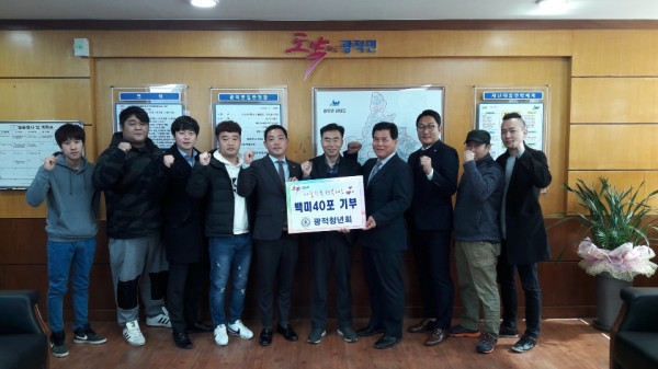경기 양주시 광적면 청년회는 4일 광적면 행정복지센터를 방문해 어려운 이웃을 위해 써달라며 백미(10kg) 40포를 기탁했다. 사진은 관계자들이 기념촬영을 하는 모습. (사진제공=양주시청)