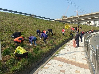 | ▲ 직원과 자원봉사회원들이 목수국 나무를 심고 있다 | ||