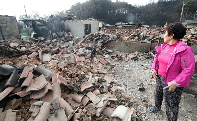 6일 오전 강원 고성군 토성면 용촌리 마을에서 산불로 모두 타버린 집을 바라보며 한숨을 쉬고 있다.