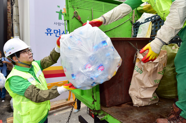 | ▲ 염태영 시장이 재활용쓰레기를 수거해 수거차량에 싣고 있다. (사진제공=수원시청) | ||