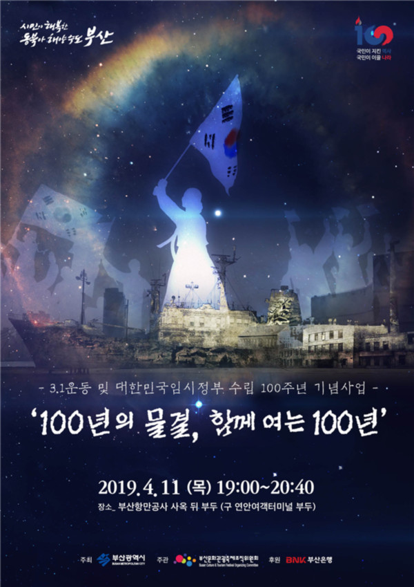[부산=최성일 기자] 부산시가 오는 11일 오후 7시 부산항만공사 사옥 뒤 부두(옛 연안여객터미널)에서 3.1운동·대한민국임시정부 수립 100주년 기념공연인 ‘100년의 물결, 함께 여는 100년’을 개최한다고 밝혔다.