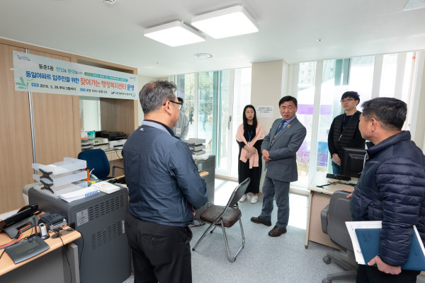 인천 연수구는 동춘1구역 8·10블록 입주를 시작한 주민을 위해 현장민원실 '찾아가는 행정복지센터'를 운영하고 있다. 구는 지난 3월 말부터 입주를 시작한 동일하이빌 아파트 1461가구에 편의 도모를 위해 약 2개월간 센터를 운영할 예정이다. 사진은 지난 5일 현장민원실을 찾은 고남석 구청장이 근무 중인 직원들을 격려하고 있는 모습. (사진제공=연수구청)