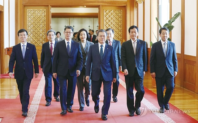 문재인 대통령이 8일 오후 청와대에서 신임 장관들에게 임명장을 수여한 후 환담장으로 이동하고 있다. 왼쪽부터 문성혁 해양수산부 장관, 노영민 대통령 비서실장, 김연철 통일부 장관, 박영선 중소벤처기업부 장관, 문 대통령, 정의용 국가안보실장, 진영 행정안전부 장관, 박양우 문화체육관광부 장관.