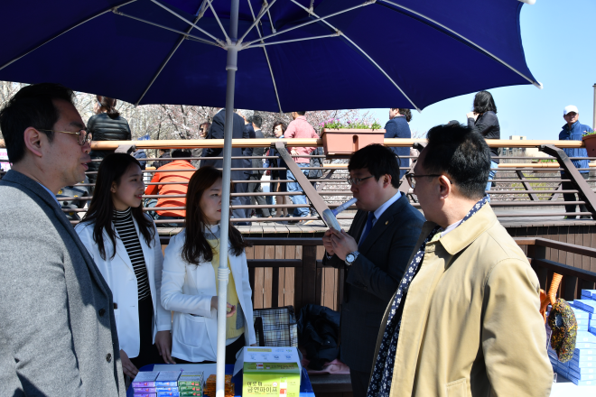 지난 3일 서울 강남구의회 의원들이 양재천 힐링 벚꽃축제’에 참여해 축제 현장을 돌아보며 구민들과 소통의 시간을 보냈다. 사진은 금연 관련프로그램 부스를 방문한 이관수 의장이 금연테스트기기를 체험해보고 있는 모습.(사진제공=강남구의회)