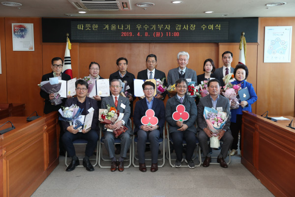 서울 성동구는 최근 어려운 이웃을 위해 나눔을 실천한 ‘2019 희망온돌 따뜻한 겨울나기’ 우수기부자에게 구청장 감사장 및 서울사회복지공동모금회장 표창장을 전달했다. 사진은 정원오 구청장(앞줄 가운데)과 우수 기부자들이 기념촬영을 하는 모습. (사진제공=성동구청)