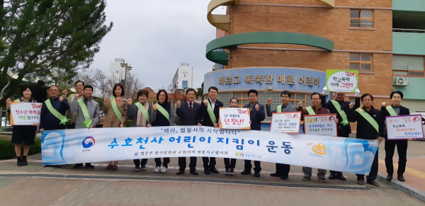 경기 수원시 영통구는 9일 법사랑 영통지구협의회와 함께 매탄동 소재의 매현초등학교에서 수호천사 어린이 지킴이 캠페인을 전개했다. 이날 참여자들은 등교하는 학생들에게 학교폭력예방 홍보물을 배부하며 학교폭력 근절 및 청소년 범죄예방에 대한 캠페인을 실시했다. 사진은 참여자들이 기념촬영을 하는 모습. (사진제공=수원시청)