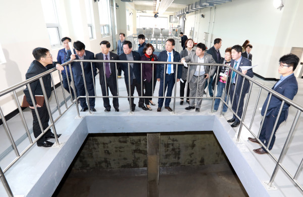 | ▲ 서운일반산업단지를 방문한 인천 계양구의원들이 기반시설 중 하나인 공공폐수처리시설을 찾아 처리능력·운영방법 등에 대한 질의를 한 뒤 관련된 설명을 듣고 있다. (사진제공=계양구의회) | ||