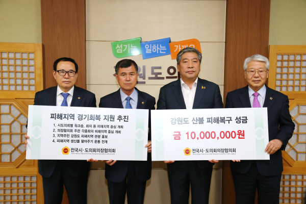 이어 그는 춘천으로 이동해 강원도청 광장에서 진행된 성금 모금방송에서 전국시도의회의장협의회에서 마련한 재난구호금 1000만원을 기탁했다.