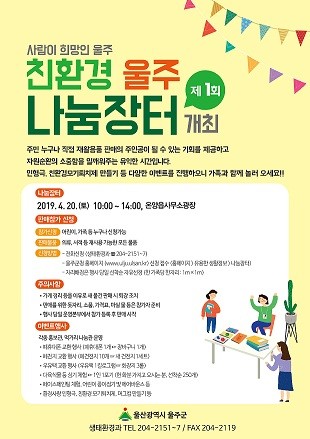 군 관계자는“친환경 울주 나눔 장터에 어린이, 학생, 가족 단위 등 울주 군민이 많이 참여하여 자원의 절약과 재활용에 대한 주민의식을 확대해 자원순환 분위기를 확산시키는 의미 있는 행사가 되길 바란다.”고 말했다.