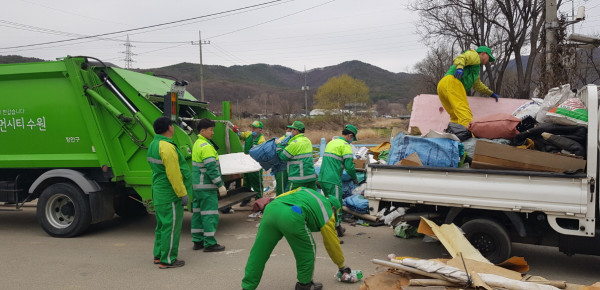 경기 수원시 장안구 연무동은 공무원과 환경관리원 등 10여명이 참여한 가운데 지난 9일 상·하광교동 영농폐기물 처리작업을 실시했다. 연무동은 이날 작업을 통해 폐기물 약 20톤과 일반 쓰레기, 재활용품 등 약 20톤을 처리했다. 사진은 참여자들이 폐기물을 처리하고 있는 모습.(사진제공=수원시청)