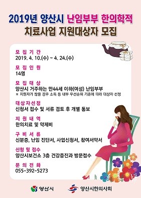 이번 사업은 양산시 거주하는 난임부부 14명을 대상으로 1인 160만원 한도에서 지원되며, 이는 경남도 지원 대상 4명 외 양산시한의사회와 양산시가 각 50%씩 사업비를 부담해 추가로 10명에게 더 혜택을 줄 수 있게 됐다. 대상자로 선정되면 사전․사후검사와 지역 내 지정 한의원에서 3개월분의 첩약과 침, 뜸, 부항 등 한의치료비가 지원된다.