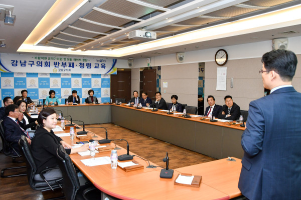 | ▲ 11일 강남구 의원들이 역량강화를 위해 반부패·청렴 교육을 듣고 있다. (사진제공=강남구의회) | ||