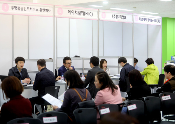 최근 서울 강남구, 서초구, 송파구, 강동구 4개구의 합동주관으로 진행된 ‘제2회 취업성공 일구데이’가 성황리에 종료됐다. 이번 행사에는 롯데칠성음료, 아성다이소 등 중견기업 포함 12개 업체가 참가했다. 사진은 구직자들이 현장면접을 진행하고 있는 모습. (사진제공=강남구청)