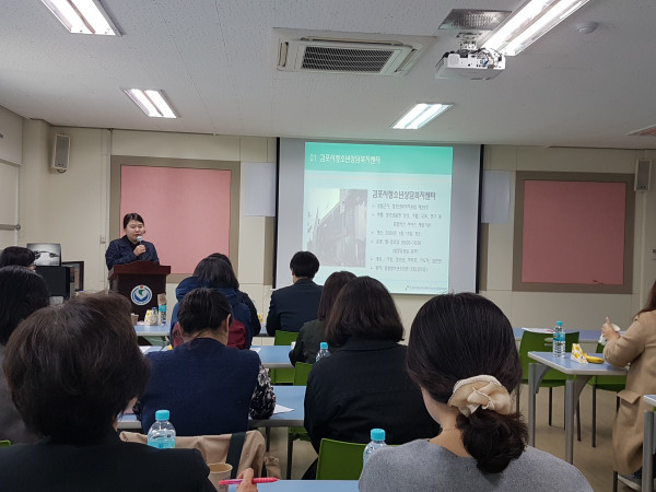 경기 김포교육지원청 Wee센터는 12일 김포 전문상담교사 및 전문상담사 42명을 대상으로 ‘2019학년도 김포 전문상담인력 역량강화 연수’를 실시했다. 사진은 강사가 김포시청소년상담복지센터에 대해 설명하고 있는 모습. (사진제공=김포교육지원청)