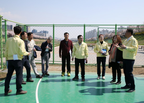 | ▲ 광명시의회 복지문화건설위원회 위원들이 안양천변의 물놀이장 등 각종시설물에 대한 점검을 하고 관계자들로부터 설명을 듣고 있다. (사진제공=광명시의회) | ||
