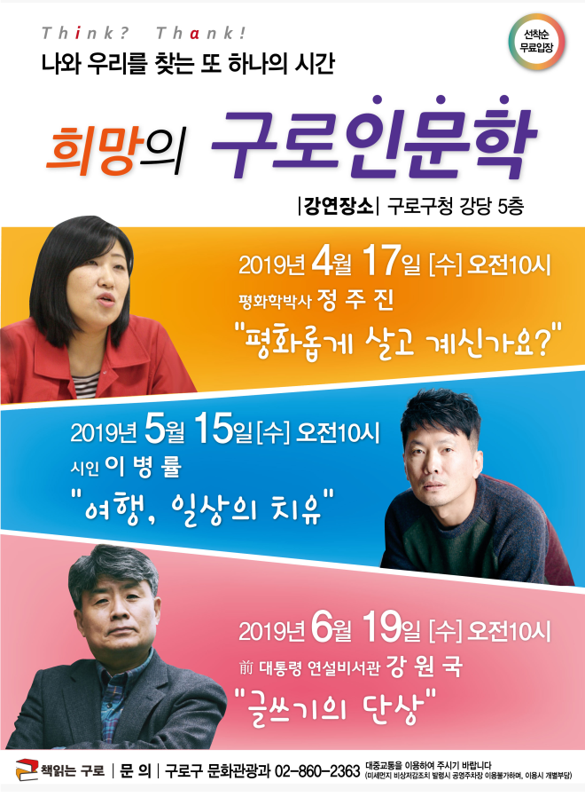 내달 15일에는 이병률 시인이 ‘여행, 일상의 치유’를 주제로 이야기를 나눈다. 장소는 구청 강당. 이 시인의 저서로는 시집 ‘바다는 잘 있습니다’, 여행산문집 ‘바람이 분다 당신이 좋다’ 등이 있다.