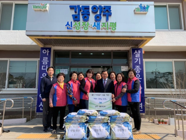 경기 양주시 남면 생활개선회는 최근 남면행정복지센터를 방문해 지역내 어려운 이웃에게 전달해 달라며 백미 10kg 22포를 기부했다. 기부물품은 꽃 판매 행사 수익을 통해 마련된 것이다. 사진은 회원들이 기념촬영을 하는 모습. (사진제공=양주시청)
