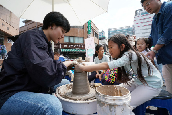 동대문구는 최근 제기동 서울약령시~서울한방진흥센터 구간에서 지역 주민과 소상공인, 사회적 경제기업 등을 하나로 잇는 ‘제4회 잇다마켓’을 개최했다. 사진은 이날 장터에 방문한 어린이들이 도자기 만들기 체험을 해보는 모습. (사진제공=동대문구청)