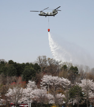 15일 오후 경기도 이천시 설봉공원에서 열린 '2019 민ㆍ관ㆍ군 재해재난 대비 통합훈련'에서 육군 항공작전사령부 CH-47 시누크 헬기가 산불 진화 훈련을 하고 있다.