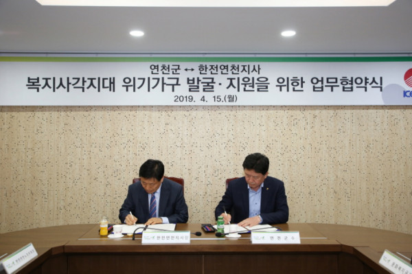경기 연천군은 한전연천지사와 15일 군청 상황실에서 '복지사각지대에 놓여진 위기가구 발굴 및 지원을 위한 업무협약'을 체결했다. 사진은 이날 협약식에서 김광철 군수(오른쪽)와 최태식 한전연천지사장이 협약서에 사인을 하고 있는 모습. (사진제공=연천군청)
