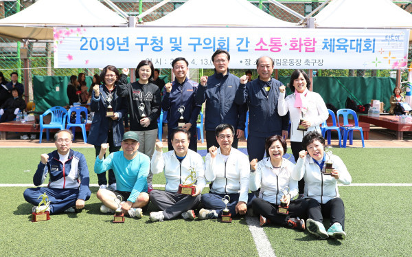 서울 영등포구가 최근 대림운동장에서 구청과 구의회 간 상호유대를 강화하고 건전한 우호관계를 다지기 위해 ‘소통·화합 체육대회’를 개최했다. 사진은 채현일 구청장(뒷줄 오른쪽에서 세번째)과 간부 및 구의원들이 '파이팅'을 외치는 모습. (사진제공=영등포구청)