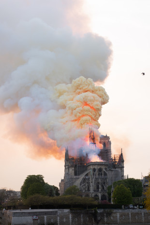 15일 저녁(현지 시간) 프랑스 파리 노트르담 대성당에서 화재가 발생, 연기와 불길이 솟구치고 있다. 1163년 공사를 시작해 1345년 축성식을 연 노트르담 대성당은 나폴레옹의 대관식과 프랑수아 미테랑 전 대통령의 장례식 등 중세부터 근대 현대까지 프랑스 역사가 숨 쉬는 장소이다.