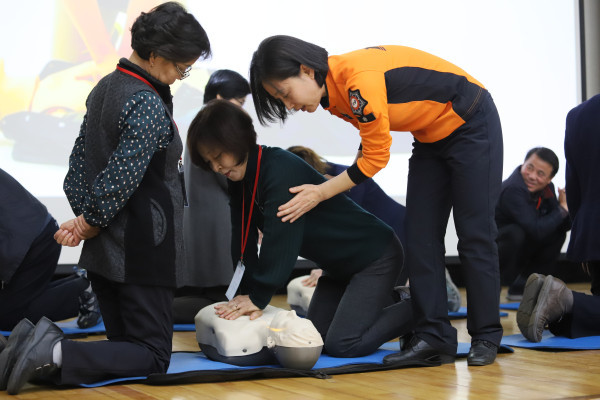 은평소방서는 16일 서울시 인재개발원에서 5급 승진리더 과정 교육생 50여 명을 대상으로 심폐소생술 교육을 진행했다. 사진은 교육 참여자들이 심페소생술 실습을 하고 있는 모습. (사진제공=은평소방서)