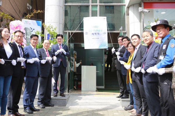 16일 서울 강동구가 노인일자리 전담기관 ‘강동시니어클럽’ 사무실을 천중로 213으로 확장 이전했다. 사진은 이날 열린 개소식에 참석한 이정훈 구청장(왼쪽에서 다섯 번째)과 참석자들이 제막식을 진행하고 있는 모습.(사진제공=강동구청)