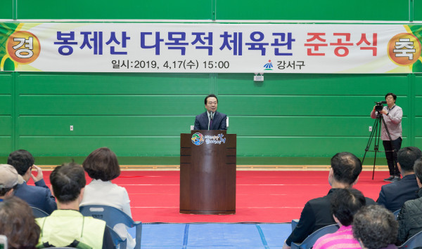 서울 강서구는 17일 봉제산 다목적체육관 신축 공사를 마치고 준공식을 개최했다. 이날 강서구체육발전위원회를 비롯해 강서구체육회, 강서구배드민턴협회, 지역 주민 등 300여명이 참석했다. 사진은 노현송 구청장이 축사를 전하는 모습. (사진제공=강서구청)
