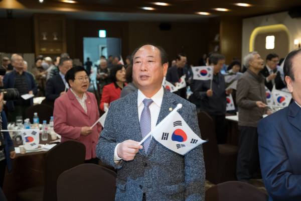 | ▲ 기념행사에 참석한 윤준용 의장이 태극기를 들고 있다. (사진제공=영등포구의회) | ||