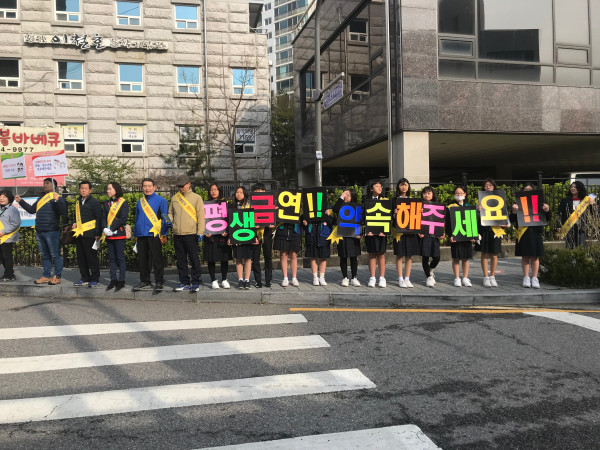 최근 서울 서초구가 학교 통학로 금연구역으로 지정된 서문여중·고교 일대에서 학생들의 통학시간 및 직장인 출근 시간대에 맞춰 '금연구역 알림 홍보 캠페인'을 실시했다. 사진은 횡단보도 앞에서 금연 문구를 들고 캠페인을 펼치고 있는 학생과 관계자들의 모습. (사진제공=서초구청)
