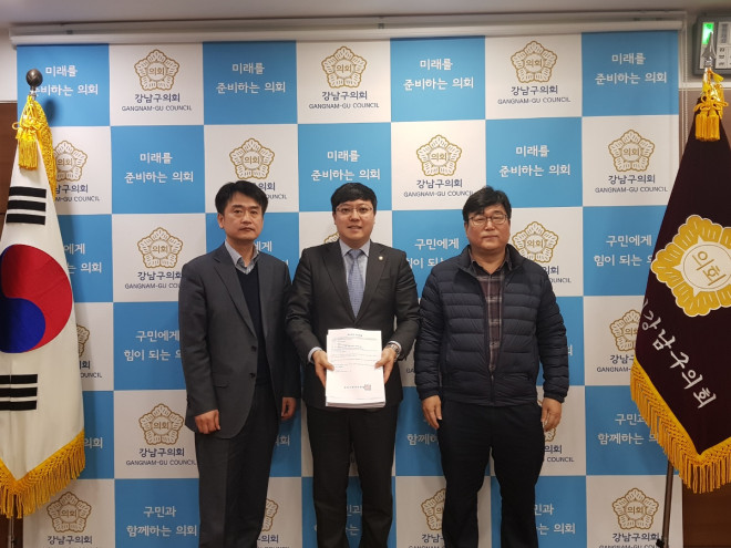 이관수 서울 강남구의회 의장이 16일 오전 구의회를 방문한 ‘세곡지역 주민연합’ 주민들로부터 위례과천선의 조속한 시행을 요청하는 내용의 탄원서 및 주민 서명부를 접수했다. 사진은 이 의장(가운데)이 주민들로부터 탄원서와 서명부를 접수 받은 후 기념촬영을 하고 있는 모습.(사진제공=강남구의회)