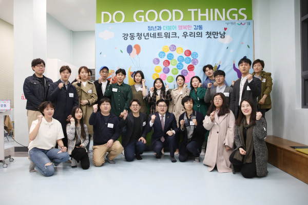 강동구가 민선7기를 맞아 청년 참여를 중심으로 한 정책 거버넌스 활성화 추진을 위해 최근 ‘청년정책위원회’와 ‘강동청년네트워크’를 각각 발족했다. 사진은 강동청년네트워크 발족식에 참석한 이정훈 구청장(앞줄 오른쪽 네 번째)이 청년들과 기념촬영을 하고 있다. (사진제공=강동구청)