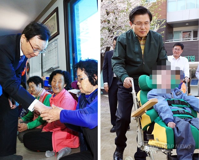 19일 산불피해 지역인 강원 고성군을 방문한 더불어민주당 이해찬 대표가 토성면 원암리 마을회관에서 산불피해를 본 주민들을 위로하고 있다. 황교안 자유한국당 대표는 이날 오후 인천시 연수구 동춘동 장애인 영·유아 시설 동심원을 방문해 장애우들과 산책하고 있다.