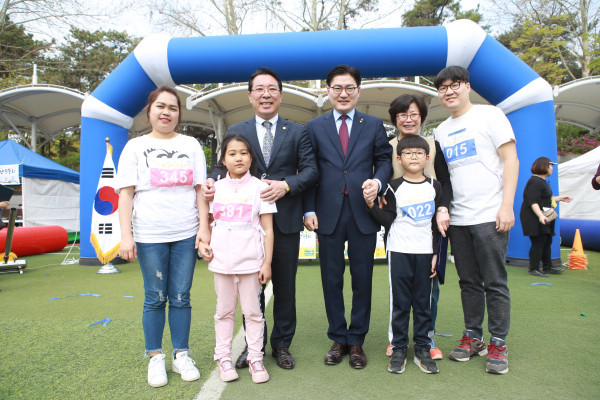 서울 강동구는 최근 고덕동에 위치한 동명인조잔디 축구장에서 다문화가족들이 참여한 가운데 ‘다 하나의 가족축제 가족명랑운동회’를 개최했다. 이날 다양한 체육활동이 진행됐다. 사진은 이정훈 구청장(가운데)과 참여 가족이 기념촬영을 하는 모습. (사진제공=강동구청)
