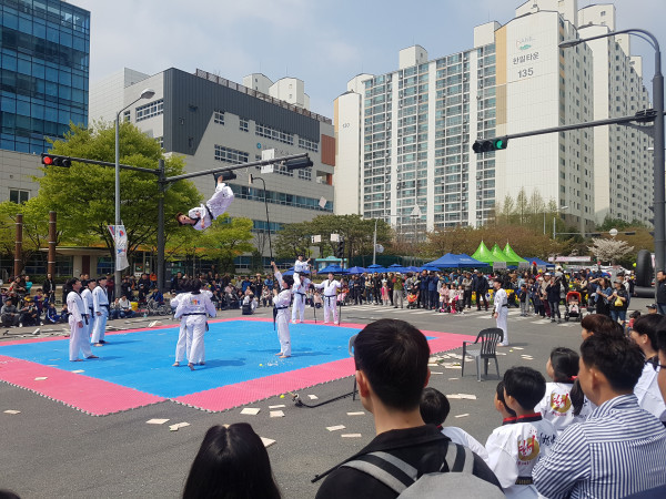 경기 수원시 장안구 조원2동은 지난 20일 한일타운 후문 진입로 일원에서 주민 1000여명이 참석한 가운데 ‘제1회 조원2동 봄꽃축제’를 성황리에 개최했다. 사진은 이날 축제에서 태권도시범단이 태권도 공연을 선보이는 모습. (사진제공=수원시청)