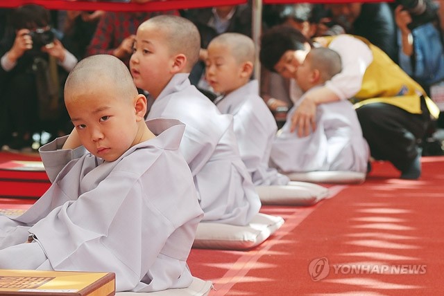 부처님오신날을 3주 가량 앞둔 22일 오전 서울 종로구 조계사 대웅전 앞에서 열린 동자승 단기출가 보리수 새싹학교 삭발·수계식에서 한 동자승이 삭발한 뒤 어색한 듯 머리를 만지고 있다.