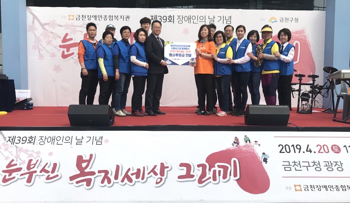 | ▲ 지난 20일 금천구청 광장에서 열린 2019 장애인의 날 기념 ‘제13회 눈부신 복지세상 그리기’ 행사에 자원봉사자로 참여한 보람상조 임직원들이 후원금을 전달하고 있다.(사진제공=보람상조) | ||