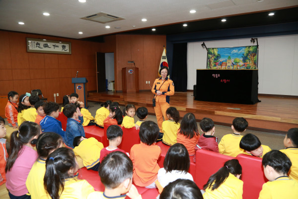 서울 영등포소방서는 23일 신길동 소재 명신유치원 유아들을 대상으로 119소방 어린이인형극을 통해 화재가 발생했을 때 대피하는 방법과 119 신고방법 등을 교육하고, 연기피난체험 등도 실시했다. 사진은 교육을 실시하고 있는 모습. (사진제공=영등포소방서)