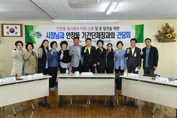 안승남 경기 구리시장이 22일 인창동 행정복지센터를 방문해 지역주민들의 오랜 숙원사업인 동 임시청사 이전 및 신축에 대한 간담회를 개최했다. 사진은 이날 열린 간담회에서 안 시장(오른쪽에서 여섯번째)과 기관단체장들의 기념촬영 모습. (사진제공=구리시청)