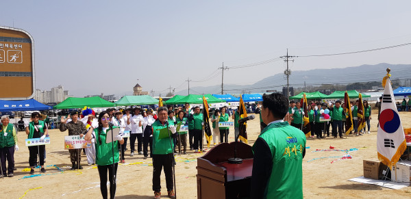 경기 양주시 새마을운동지회가 22일 나리공원에서 '제9회 새마을의 날' 기념식 및 한마음 체육대회를 개최했다. 이날 행사는 350여명의 관계자가 참석한 가운데 진행됐다. 사진은 체육대회 시작 전 선서를 하고 있는 참가자들의 모습. (사진제공=양주시청)