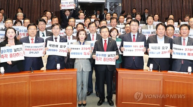 자유한국당 황교안 대표와 나경원 원내대표 등 의원들이 23일 오전 국회에서 열린 긴급 의원총회에서 현안 관련 피켓을 들고 구호를 외치고 있다.
